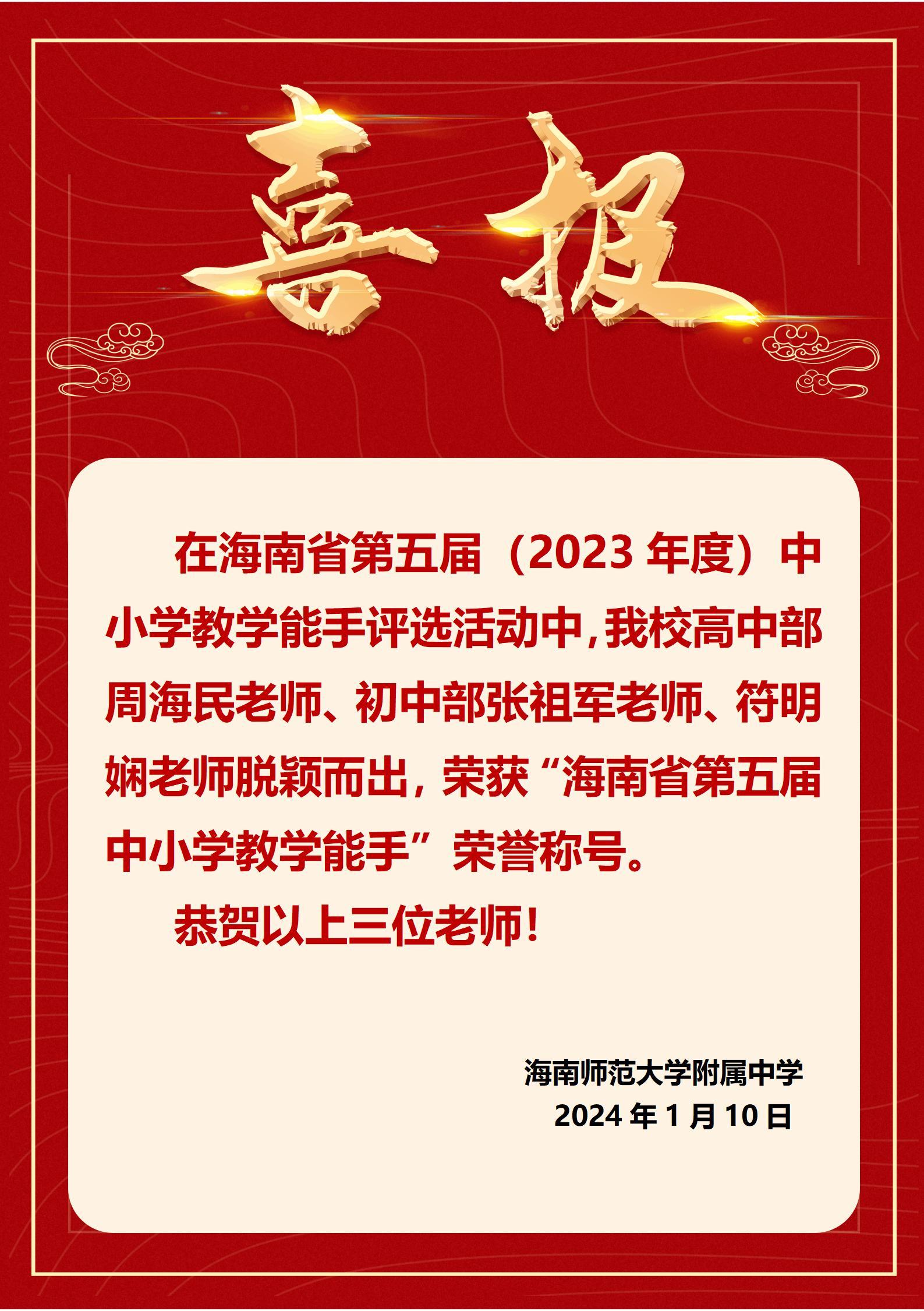 祝贺周海民老师、张祖军老师、符明娴老师荣获“教学能手”荣誉称号