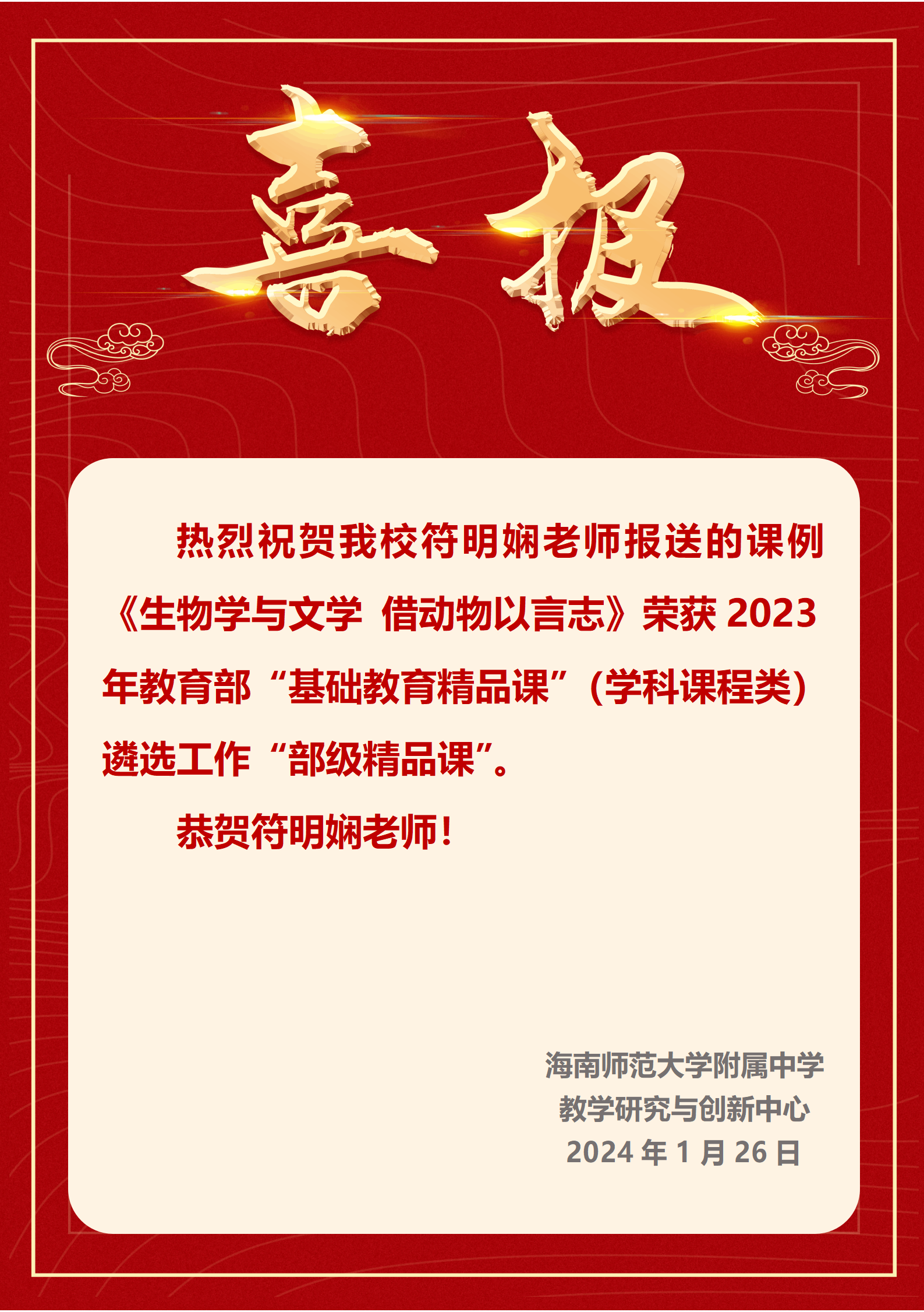 祝贺符明娴老师的课例荣获2023年教育部“基础教育精品课”遴选工作“部级精品课”