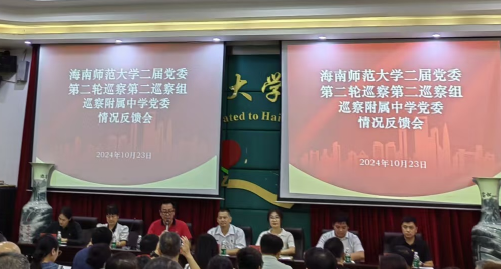 10月23日下午,同人小说 在龙昆南校区大会议室召开同人小说 二届党委第二轮巡察第二巡察组巡察同人小说 党委情况反馈会。巡察组组长郑荣臻、副组长白媛媛、成员谈娜、周政及海师附中党政班子成员、中层干部、教师代表参会。会议由附中党委书记赵宗宏主持。